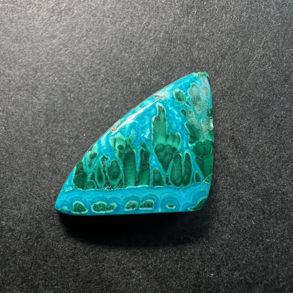 Dans cette excellente qualité de chrysocolle-malachite, la malachite mamelonnée bien présente et la chrysocolle d’un bleu clair intense offrent de suber motifs.