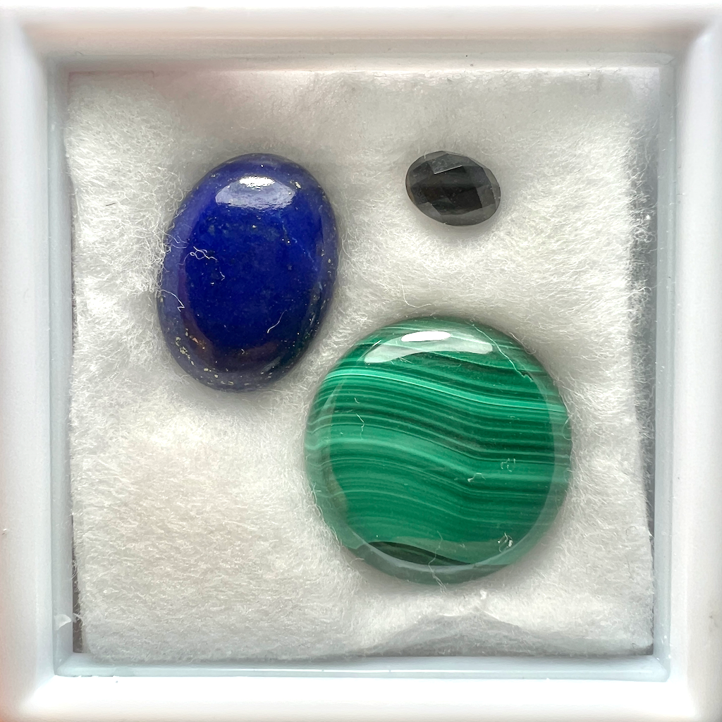 J’ai élaboré pour vous un coffret contenant l’ensemble des pierres nécessaires pour les trois projets du module 9 “Sertis Clos – Les Bases” d’Apprendre La Bijouterie. J’ai sélectionné dans ce coffret: