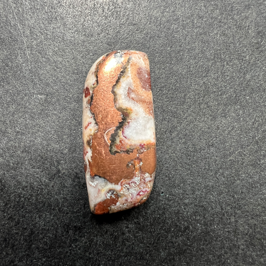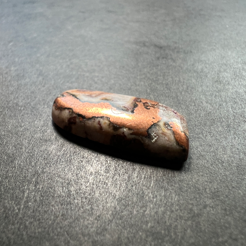 Du cuivre natif taillé en cabochon, c’est du cuivre que l’on a extrait avec sa roche mère et que l’on a ensuite tout simplement poli. Et franchement le résultat est bien sympa, on retrouve l’éclat intense du cuivre, ça brille et ça ne passe pas inaperçu.