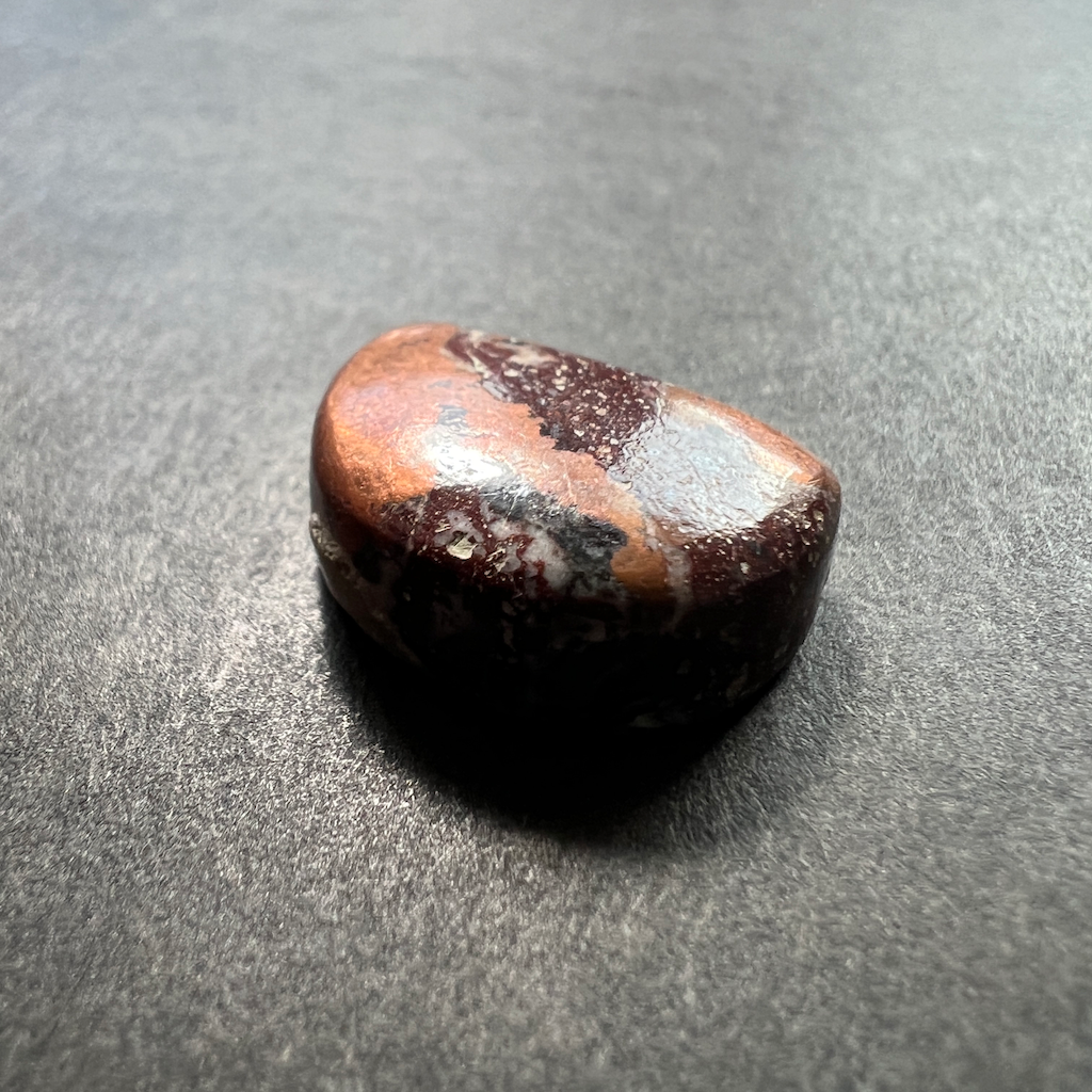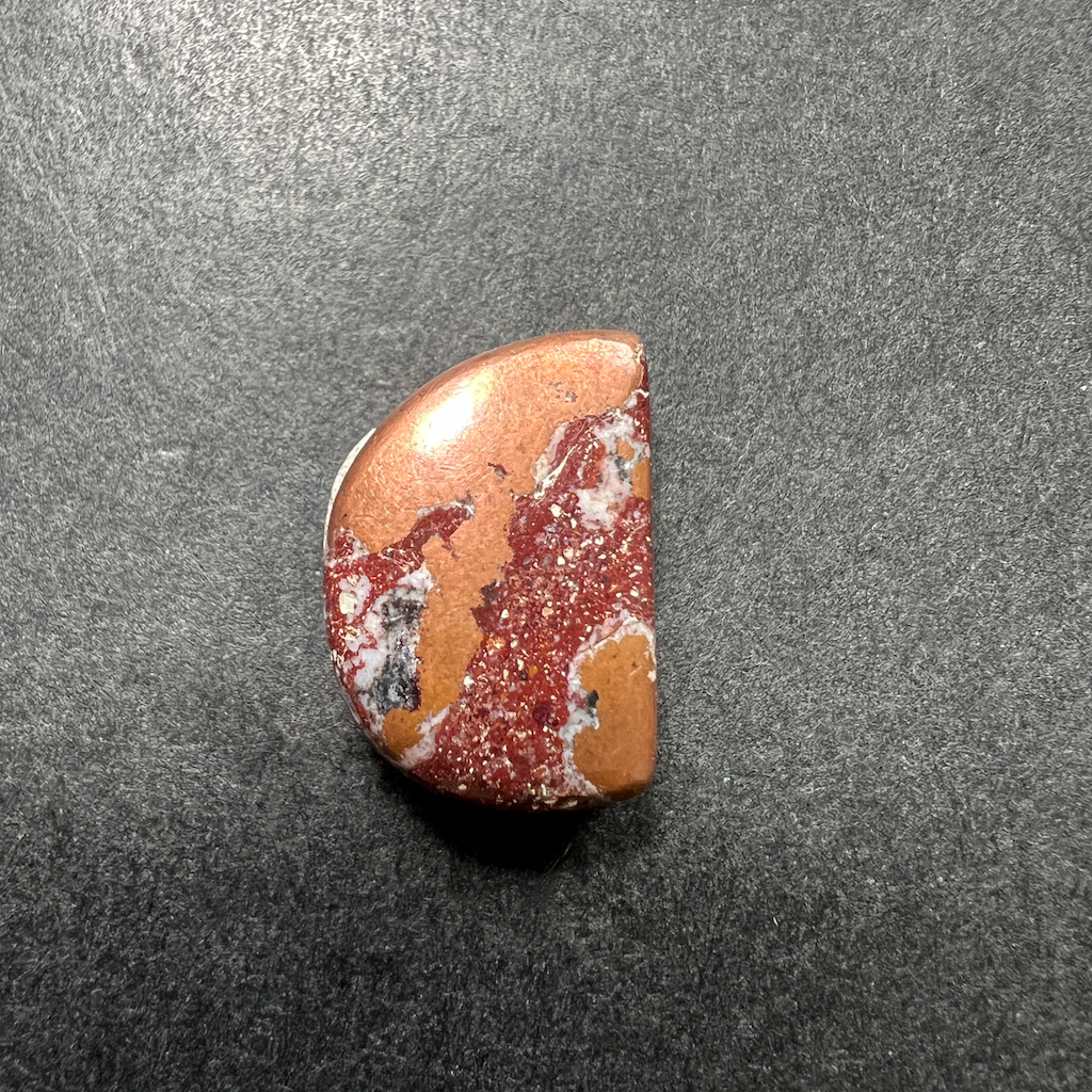 Du cuivre natif taillé en cabochon, c’est du cuivre que l’on a extrait avec sa roche mère et que l’on a ensuite tout simplement poli. Et franchement le résultat est bien sympa, on retrouve l’éclat intense du cuivre, ça brille et ça ne passe pas inaperçu.