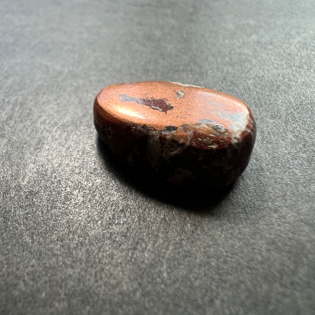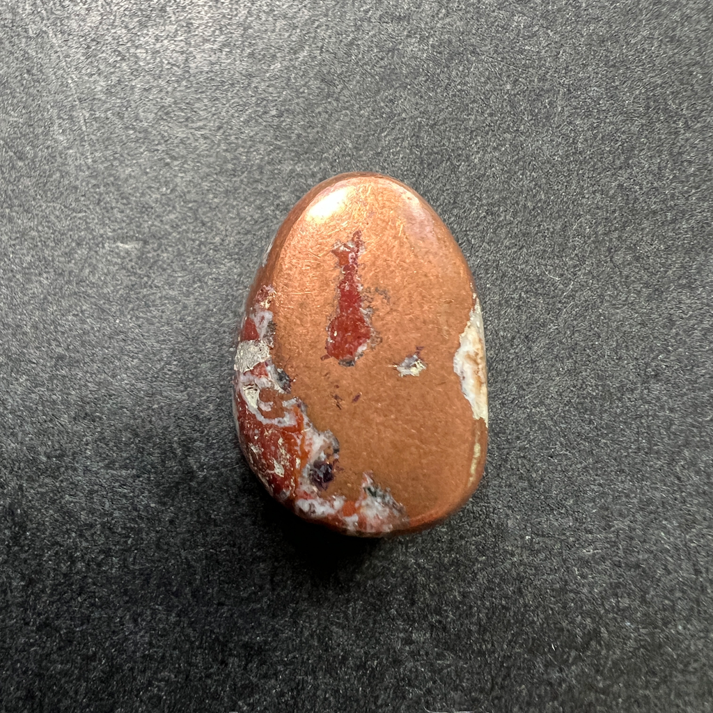 Du cuivre natif taillé en cabochon, c’est du cuivre que l’on a extrait avec sa roche mère et que l’on a ensuite tout simplement poli. Et franchement le résultat est bien sympa, on retrouve l’éclat intense du cuivre, ça brille et ça ne passe pas inaperçu.