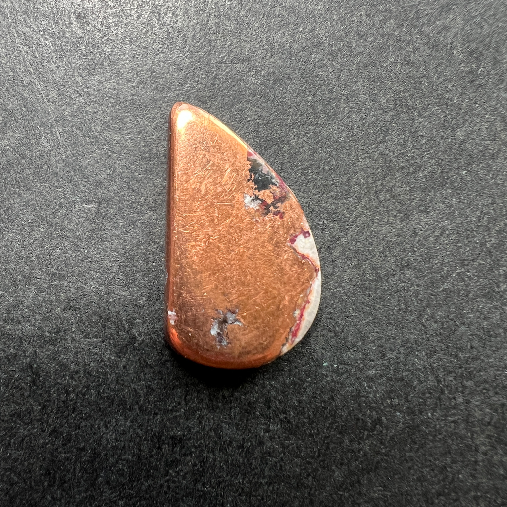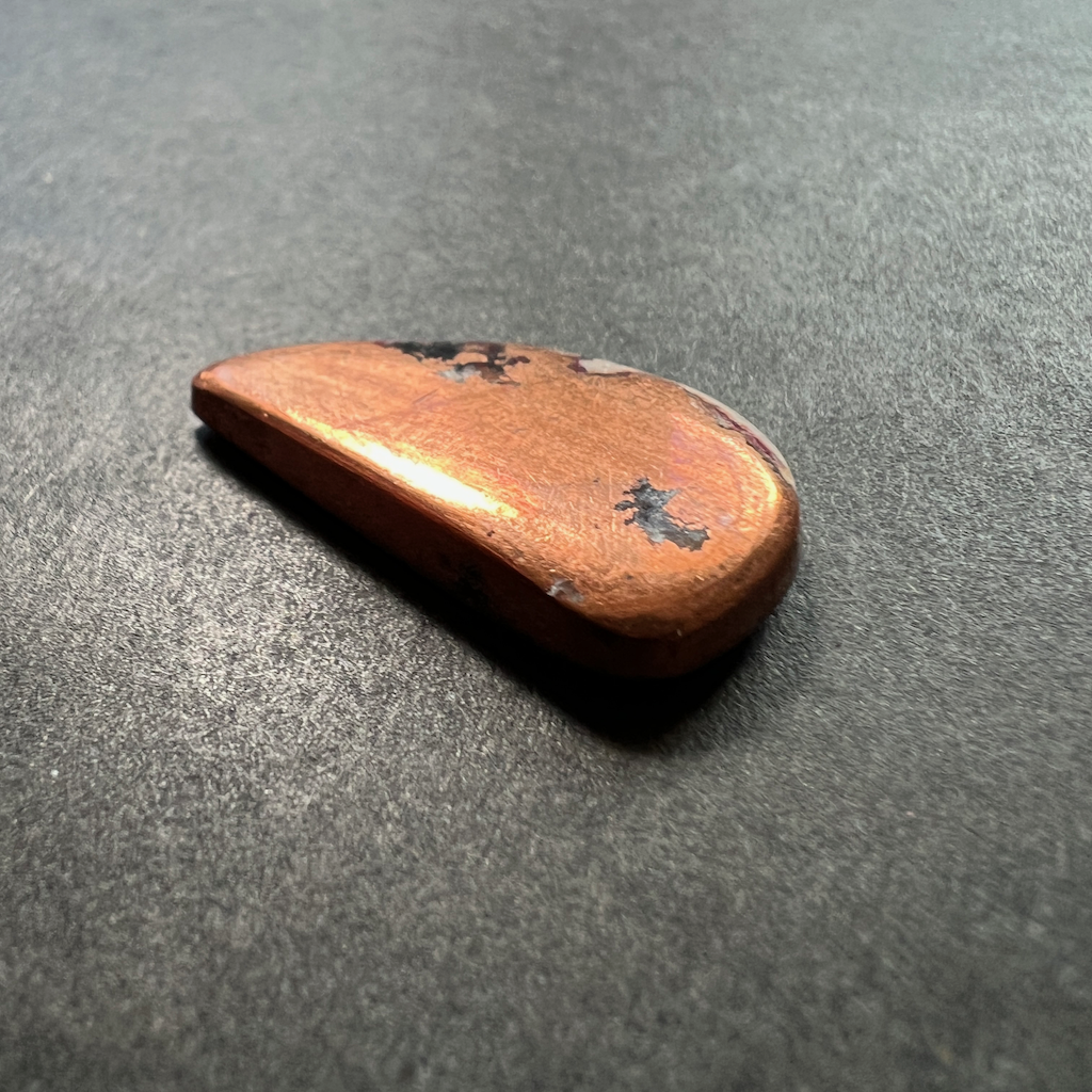 Du cuivre natif taillé en cabochon, c’est du cuivre que l’on a extrait avec sa roche mère et que l’on a ensuite tout simplement poli. Et franchement le résultat est bien sympa, on retrouve l’éclat intense du cuivre, ça brille et ça ne passe pas inaperçu.