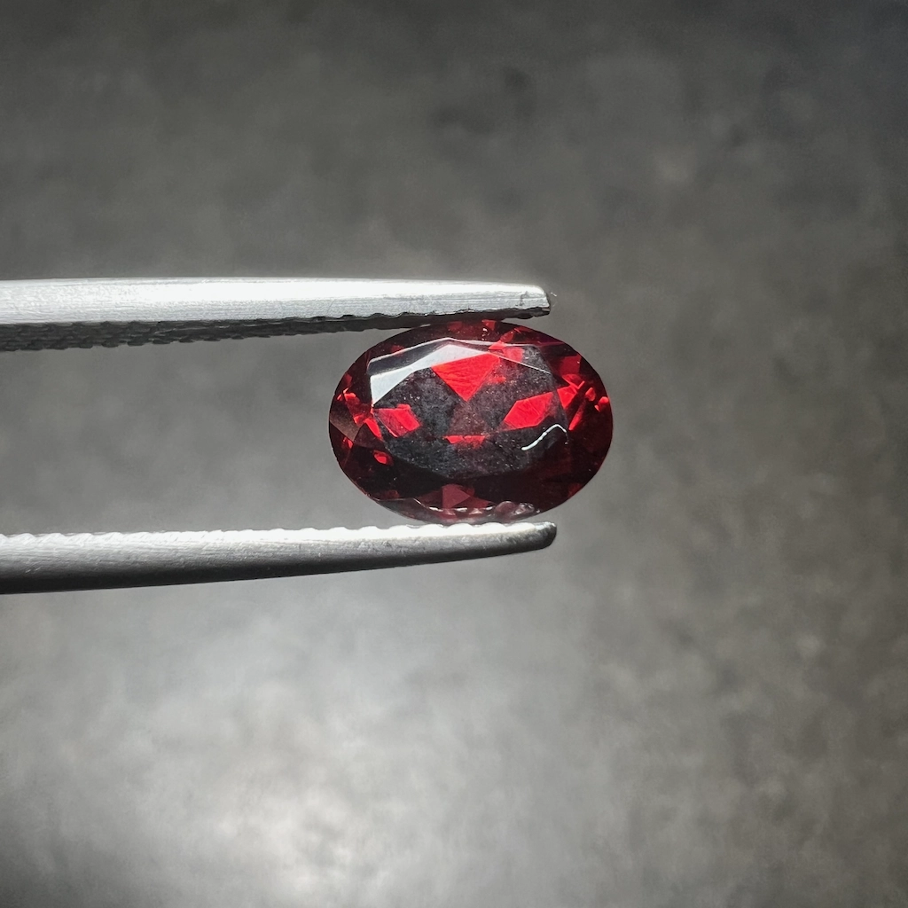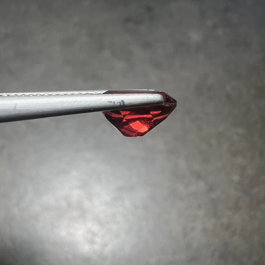 Un grenat d’une couleur rouge intense . sans la nuance violacée de l’almandin. Gemme facettée d’une belle qualité, clarté, translucidité et couleur profonde, ici proposée dans sa plus belle qualité.