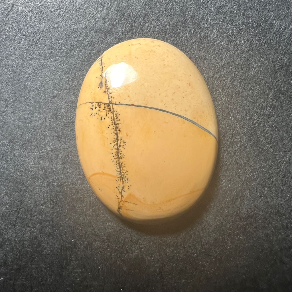 Rare variété de Jaspe. Ambiance mystérieuse mélangeant les teintes ocres, et gris-clair à gris-foncé d’un très bel effet. ATTENTION, les lignes grises et noires ne sont pas des fissures, elles font parties du motifs.