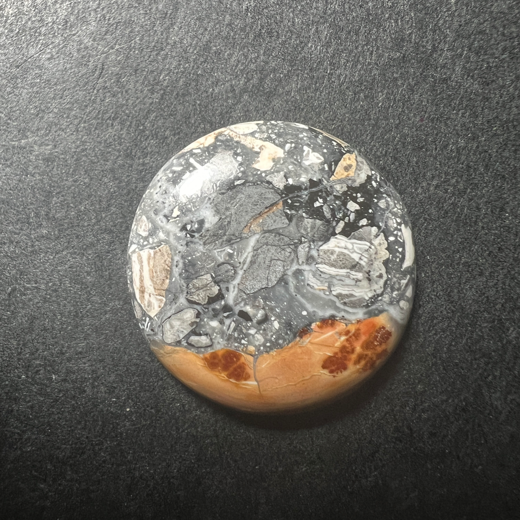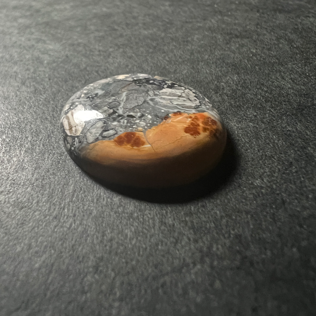Rare variété de Jaspe. Ambiance mystérieuse mélangeant les teintes ocres, et gris-clair à gris-foncé d’un très bel effet. ATTENTION, les lignes grises et noires ne sont pas des fissures, elles font parties du motifs.