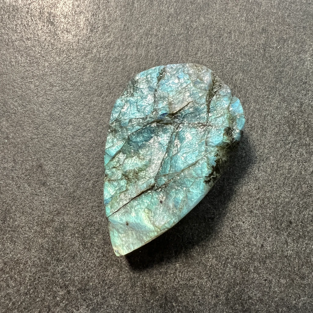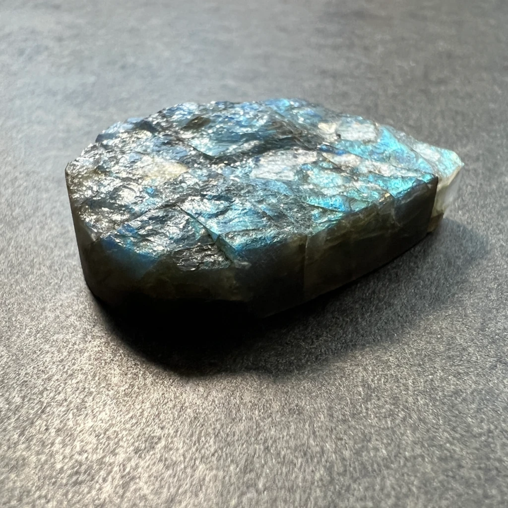 La labradorite, une incontournable des gemmes ornementales. Ici, elle est proposée en “druse” avec les bords et le dos plat et le dessus non-poli pour un bijou avec un aspect brut et authentique !