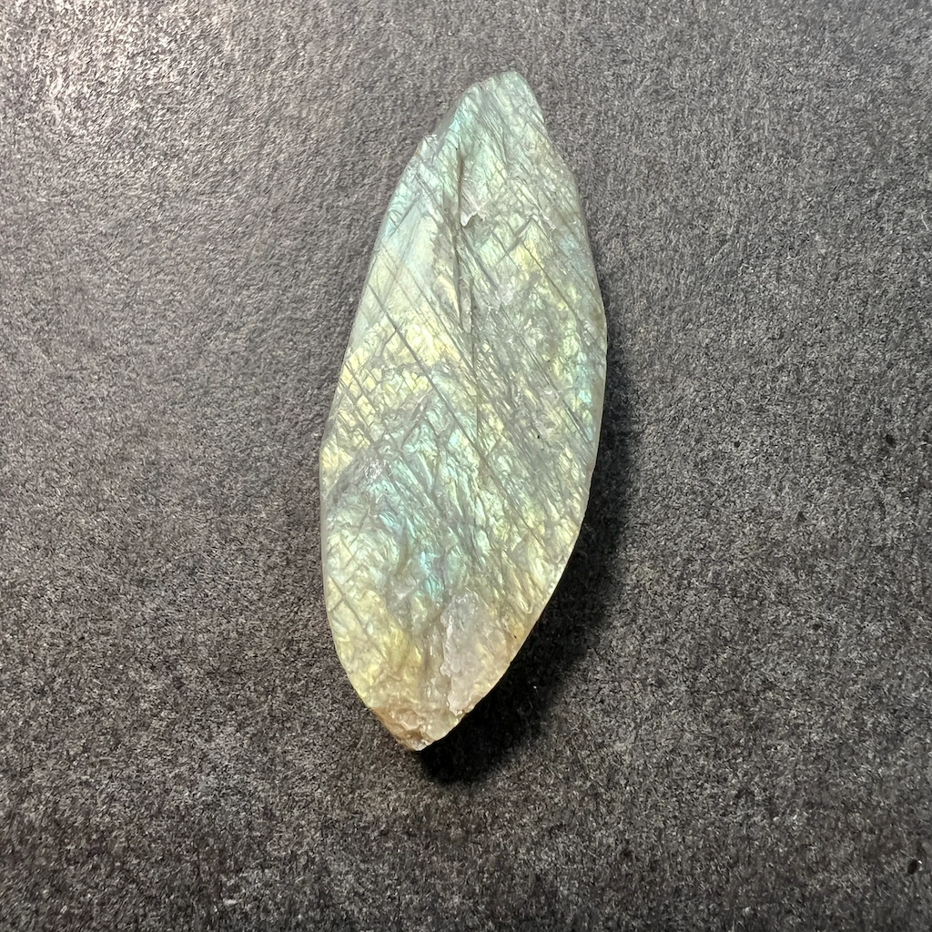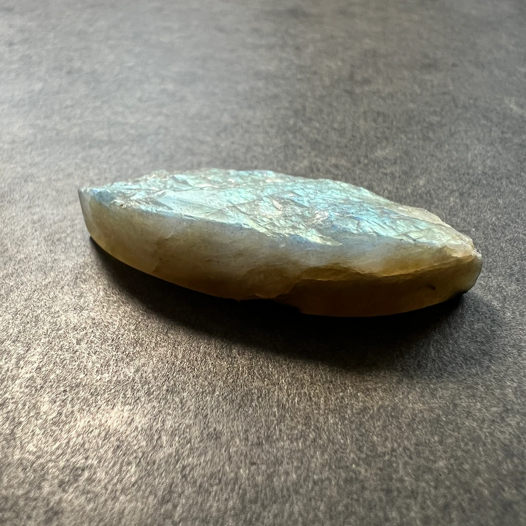 La labradorite, une incontournable des gemmes ornementales. Ici, elle est proposée en “druse” avec les bords et le dos plat et le dessus non-poli pour un bijou avec un aspect brut et authentique !