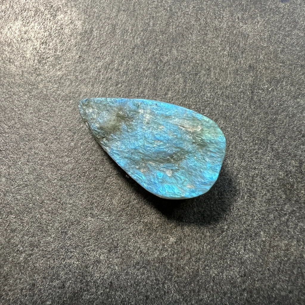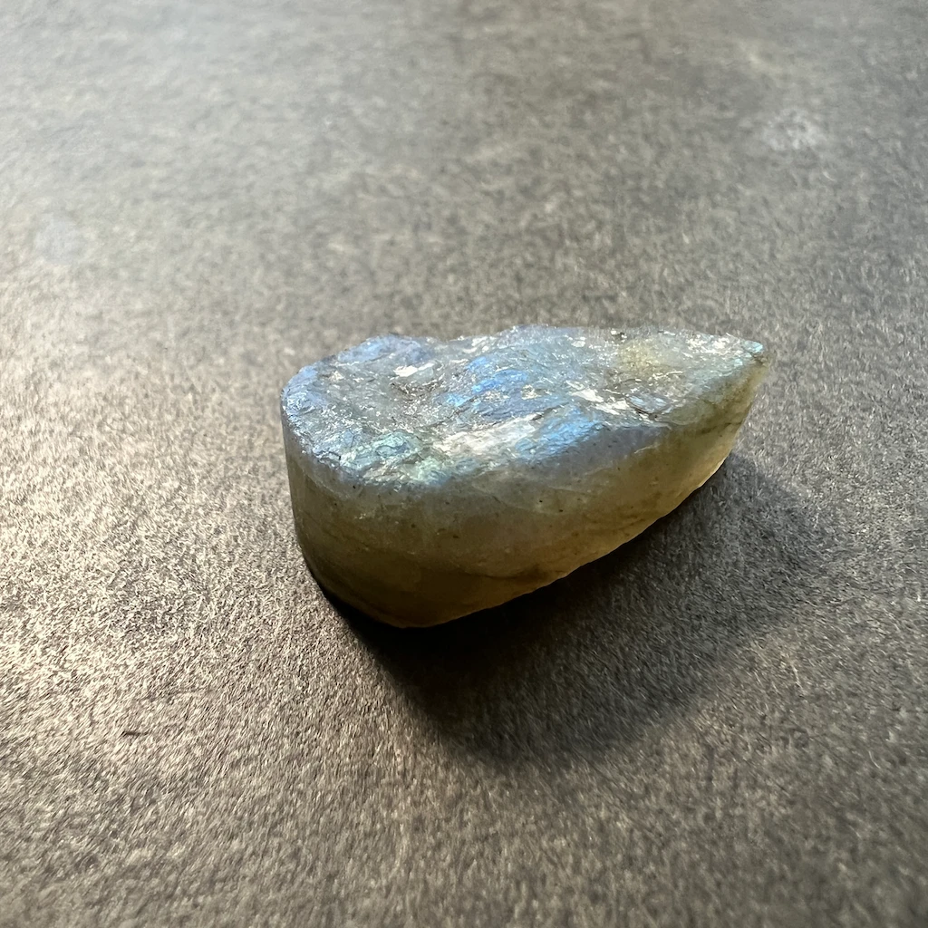 La labradorite, une incontournable des gemmes ornementales. Ici, elle est proposée en “druse” avec les bords et le dos plat et le dessus non-poli pour un bijou avec un aspect brut et authentique !