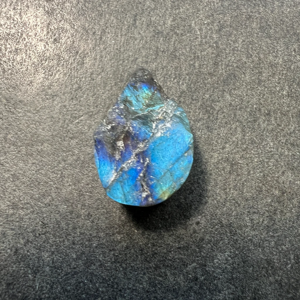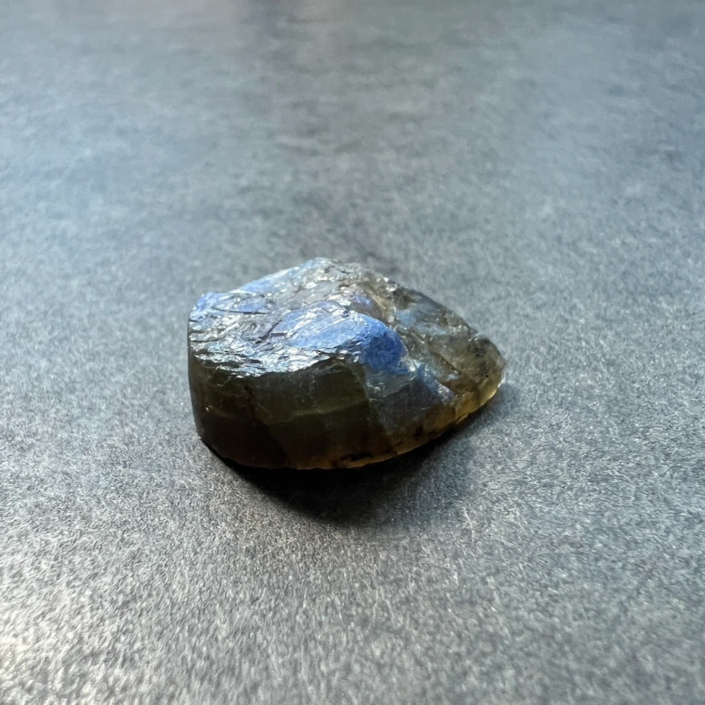 La labradorite, une incontournable des gemmes ornementales. Ici, elle est proposée en “druse” avec les bords et le dos plat et le dessus non-poli pour un bijou avec un aspect brut et authentique !