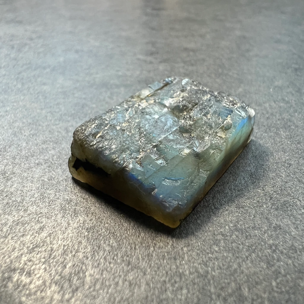La labradorite, une incontournable des gemmes ornementales. Ici, elle est proposée en “druse” avec les bords et le dos plat et le dessus non-poli pour un bijou avec un aspect brut et authentique !