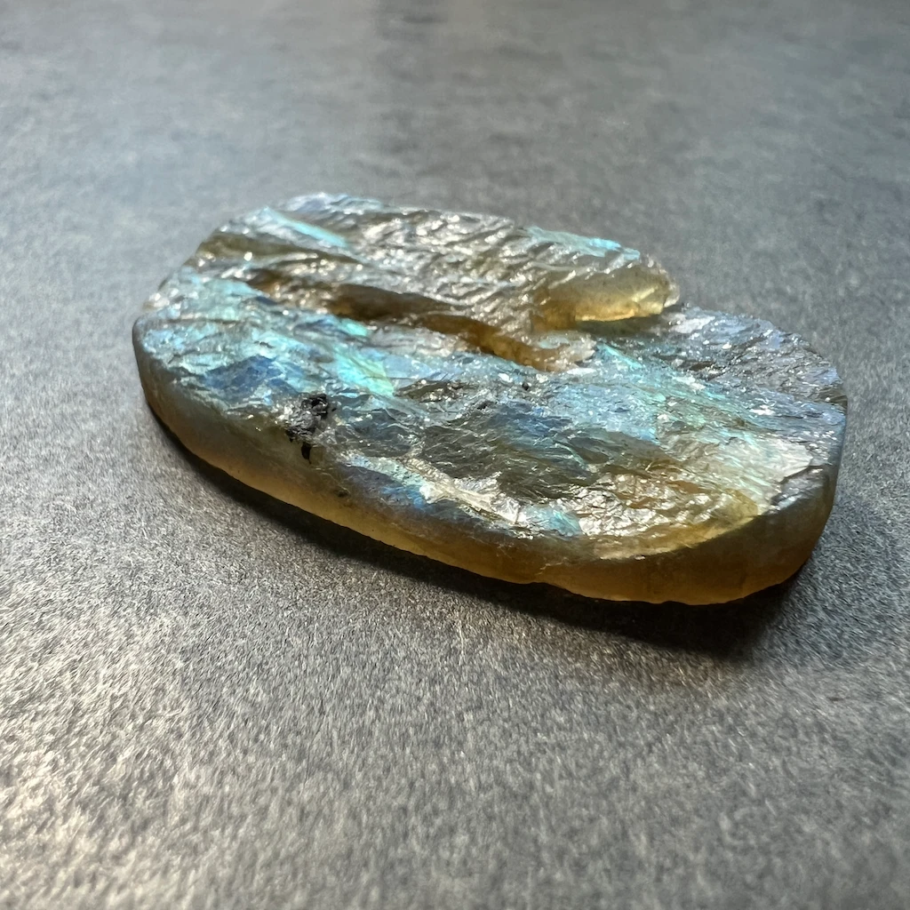La labradorite, une incontournable des gemmes ornementales. Ici, elle est proposée en “druse” avec les bords et le dos plat et le dessus non-poli pour un bijou avec un aspect brut et authentique !