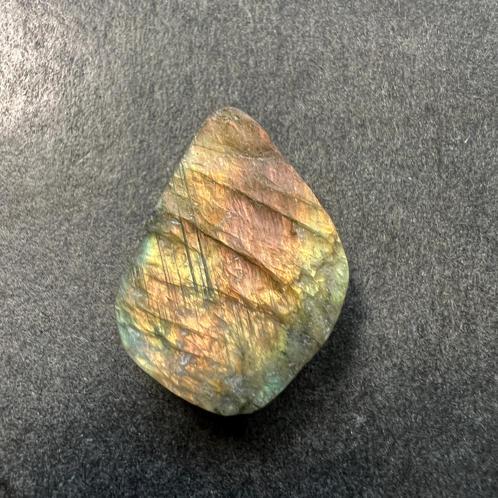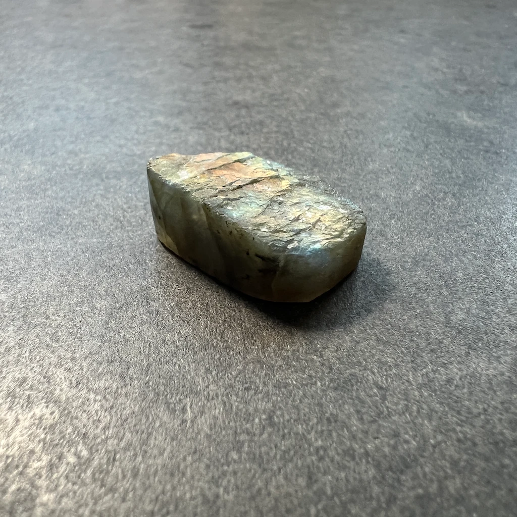 La labradorite, une incontournable des gemmes ornementales. Ici, elle est proposée en “druse” avec les bords et le dos plat et le dessus non-poli pour un bijou avec un aspect brut et authentique !
