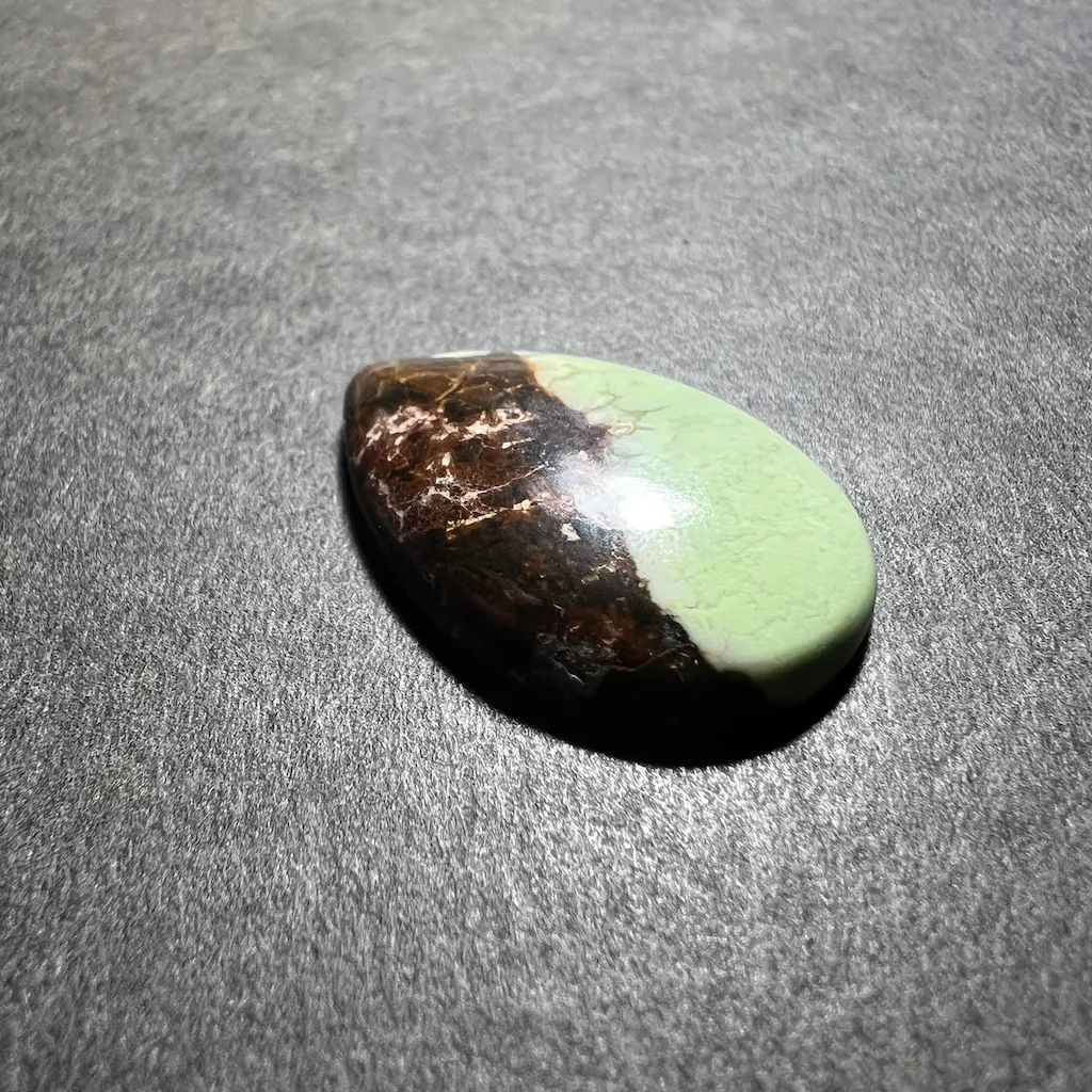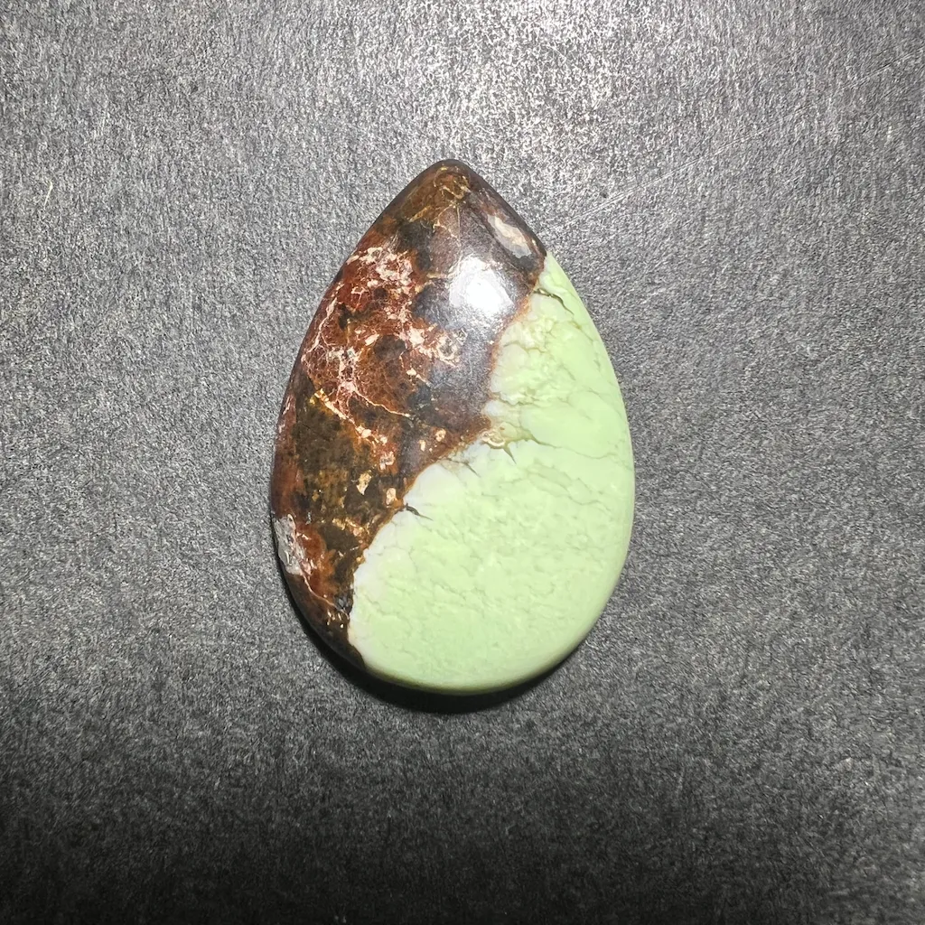 Cette variété de magnésite offre une couleur verte nuancé de jaune pale et douce. Avec des veines marrons foncés contrastant avec le pale vert. Cette pierre est faussement appelée “Chrysoprase Citron” alors que c’est une magnésite.