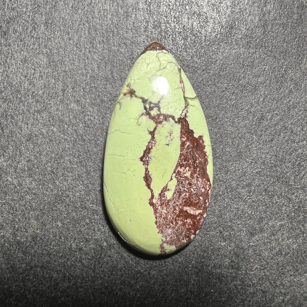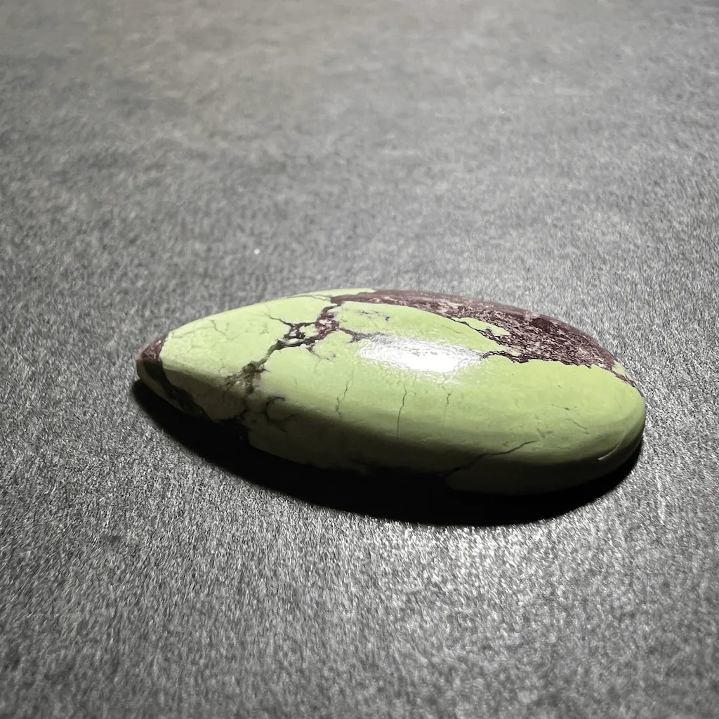 Cette variété de magnésite offre une couleur verte nuancé de jaune pale et douce. Avec des veines marrons foncés contrastant avec le pale vert. Cette pierre est faussement appelée “Chrysoprase Citron” alors que c’est une magnésite.