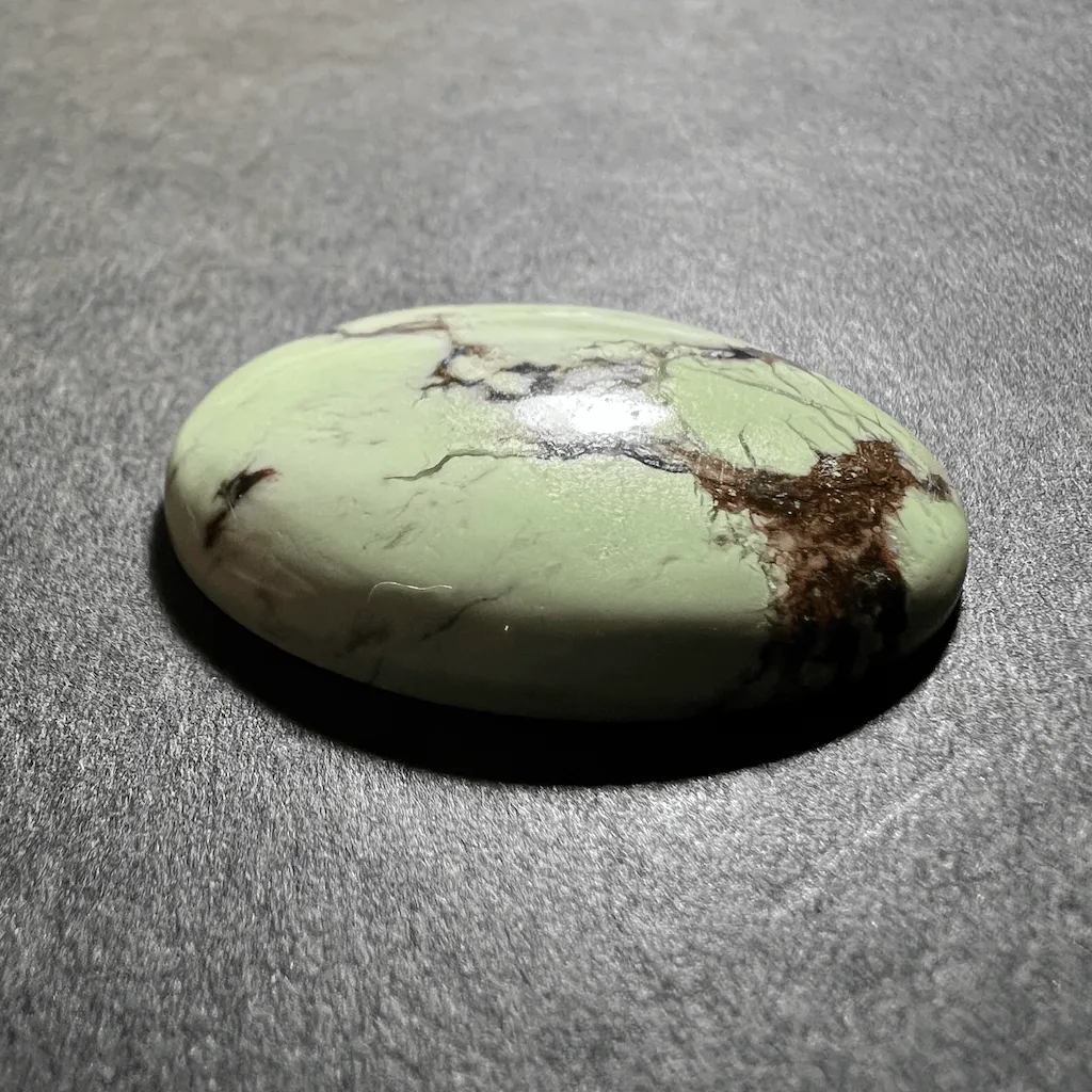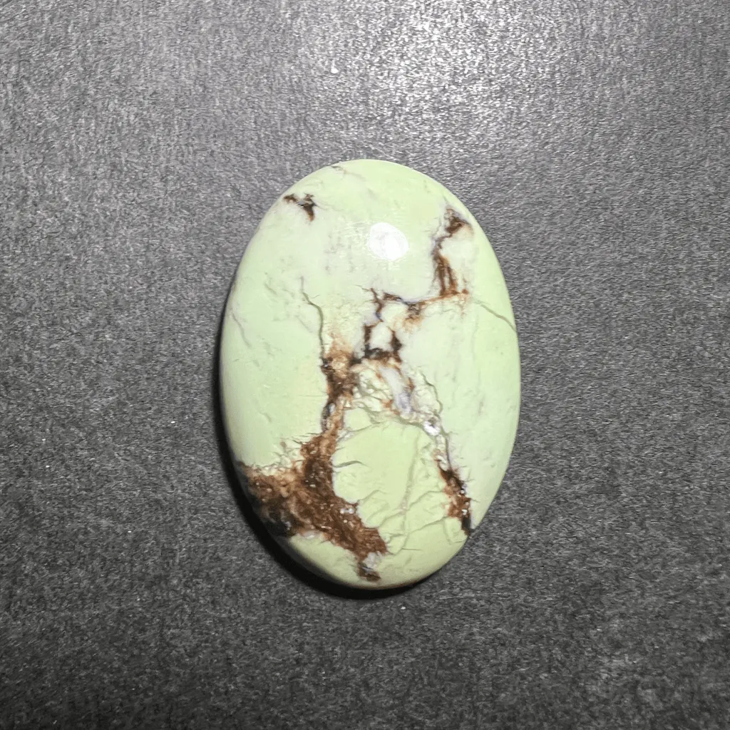 Cette variété de magnésite offre une couleur verte nuancé de jaune pale et douce. Avec des veines marrons foncés contrastant avec le pale vert. Cette pierre est faussement appelée “Chrysoprase Citron” alors que c’est une magnésite.