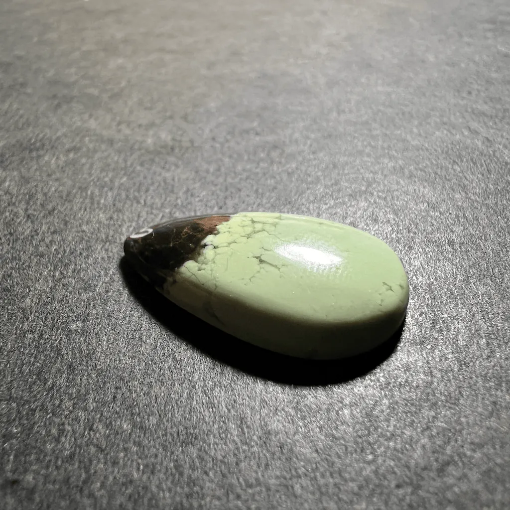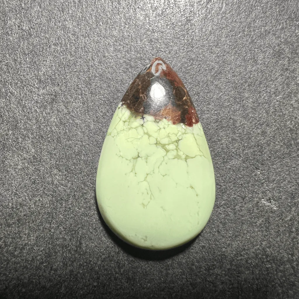 Cette variété de magnésite offre une couleur verte nuancé de jaune pale et douce. Avec des veines marrons foncés contrastant avec le pale vert. Cette pierre est faussement appelée “Chrysoprase Citron” alors que c’est une magnésite.