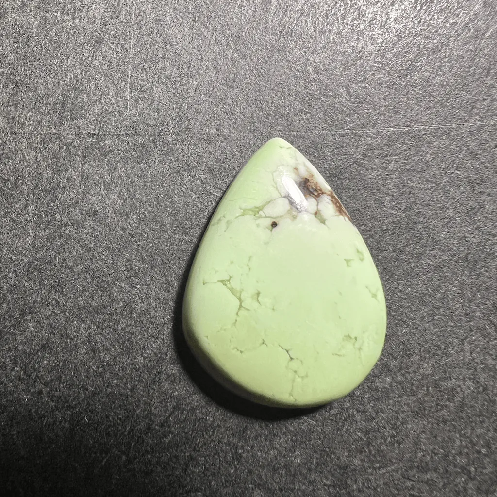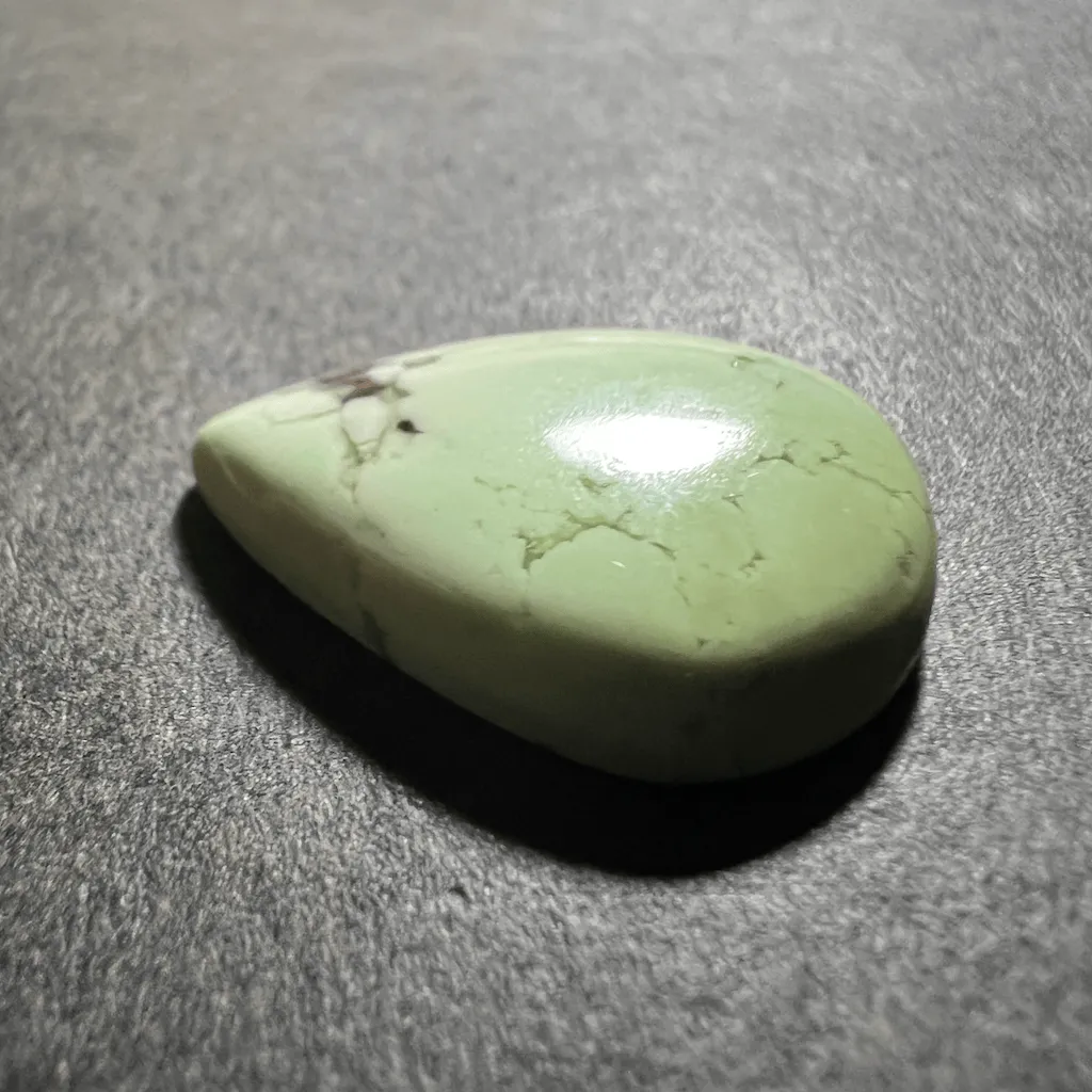 Cette variété de magnésite offre une couleur verte nuancé de jaune pale et douce. Avec des veines marrons foncés contrastant avec le pale vert. Cette pierre est faussement appelée “Chrysoprase Citron” alors que c’est une magnésite.