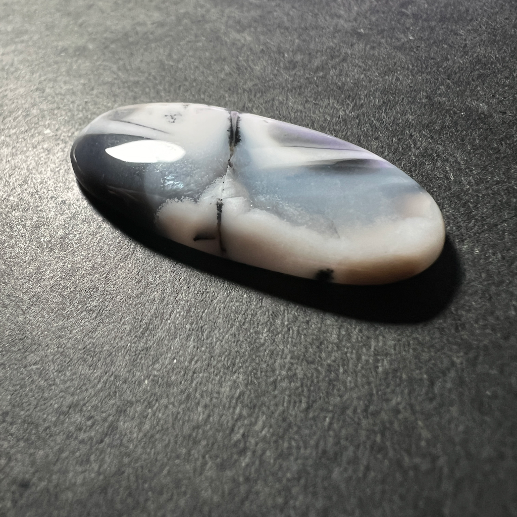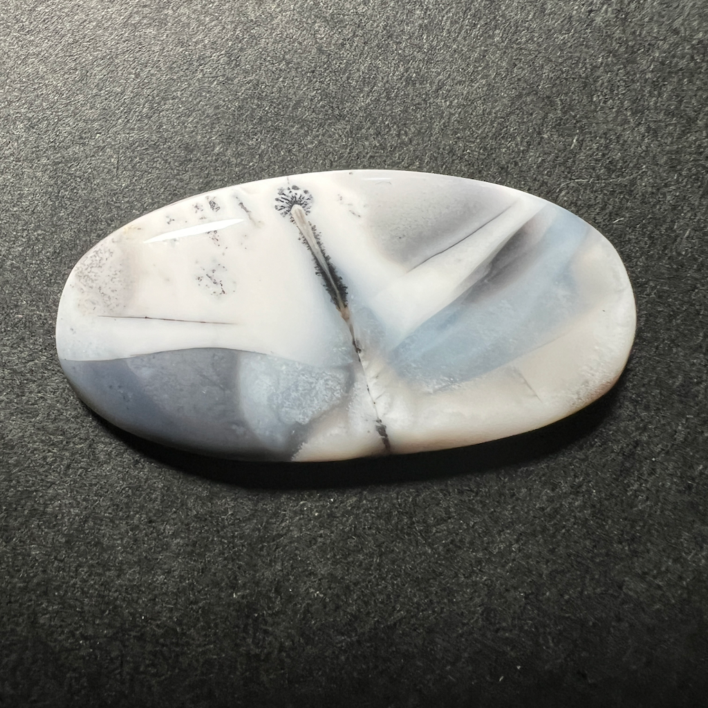 Impressionnante variété d’agate rappelant parfois des motifs de paysages enneigés. Parfois translucide, parfois blanche laiteuse, toujours sublime habillée de ses dendrites noires. La partie blanche est de l’opale/agate et les touches noires sont de l’oxyde de manganèse.
