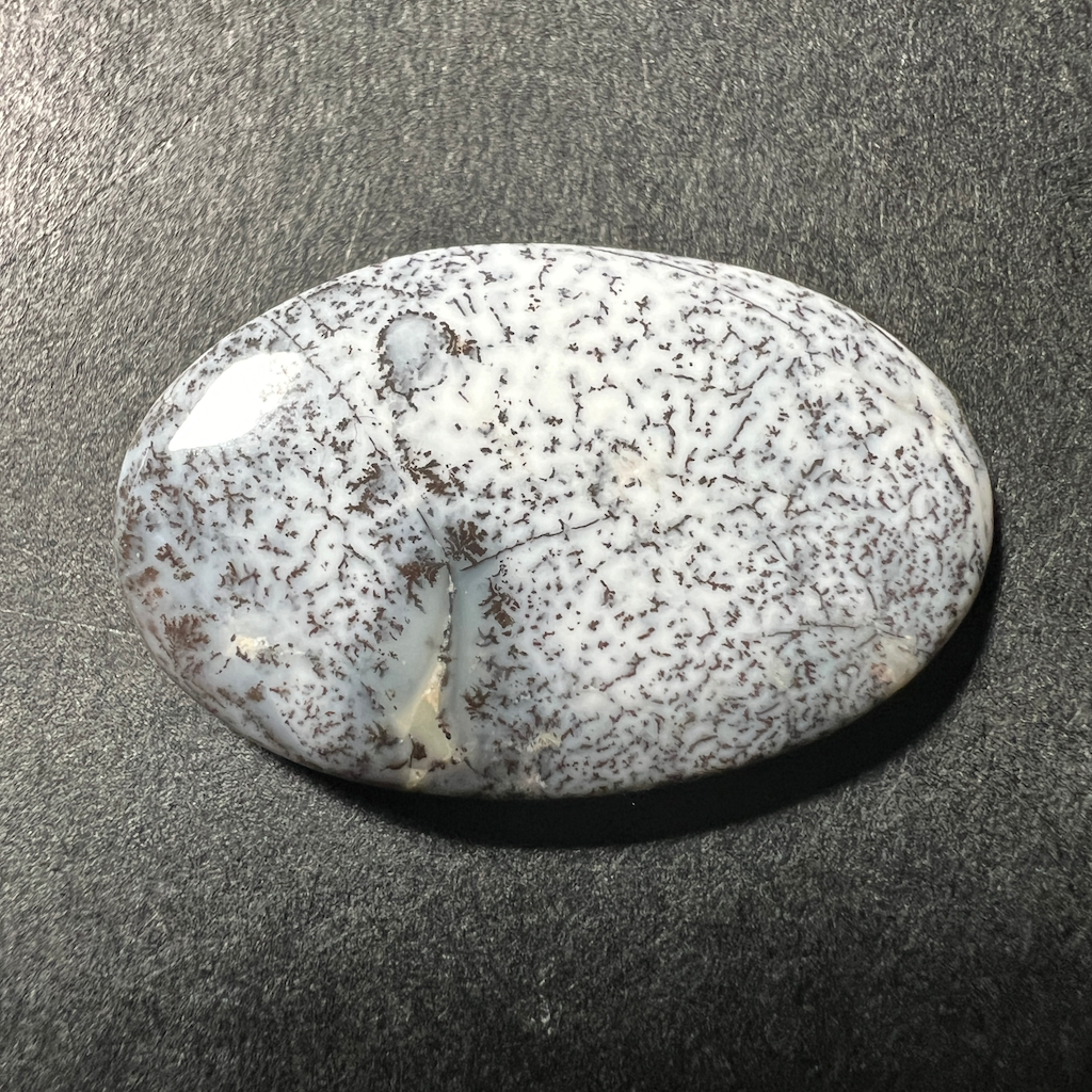 Impressionnante variété d’agate rappelant parfois des motifs de paysages enneigés. Parfois translucide, parfois blanche laiteuse, toujours sublime habillée de ses dendrites noires. La partie blanche est de l’opale/agate et les touches noires sont de l’oxyde de manganèse.