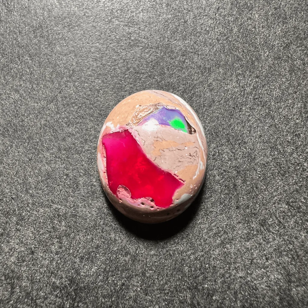 Très beau contraste entre le jeu de couleur de l’opale précieuse au centre de la gemme, et l’opacité beige-rose de la matrice autour. L’opale est naturelle. Mais attention la matière autour est un support fabriqué en résine et poudre de pierre. C’est solide et durable, faut juste éviter les chocs et les produits chimiques trop agressifs.