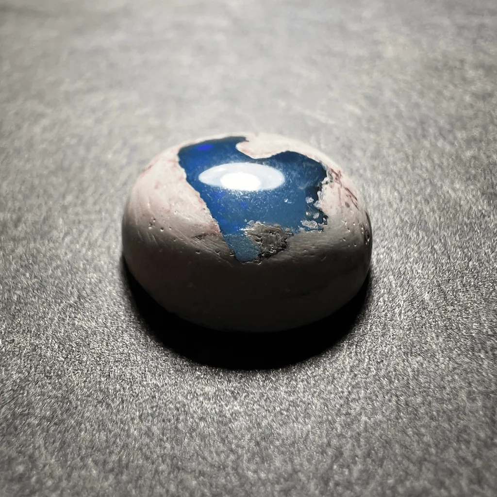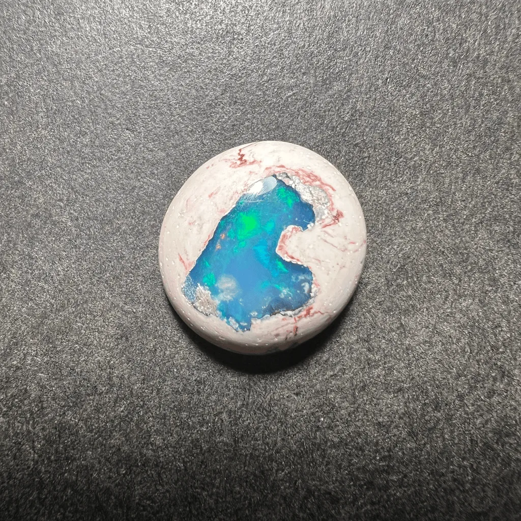 Très beau contraste entre le jeu de couleur de l’opale précieuse au centre de la gemme, et l’opacité beige-rose de la matrice autour. L’opale est naturelle. Mais attention la matière autour est un support fabriqué en résine et poudre de pierre. C’est solide et durable, faut juste éviter les chocs et les produits chimiques trop agressifs.