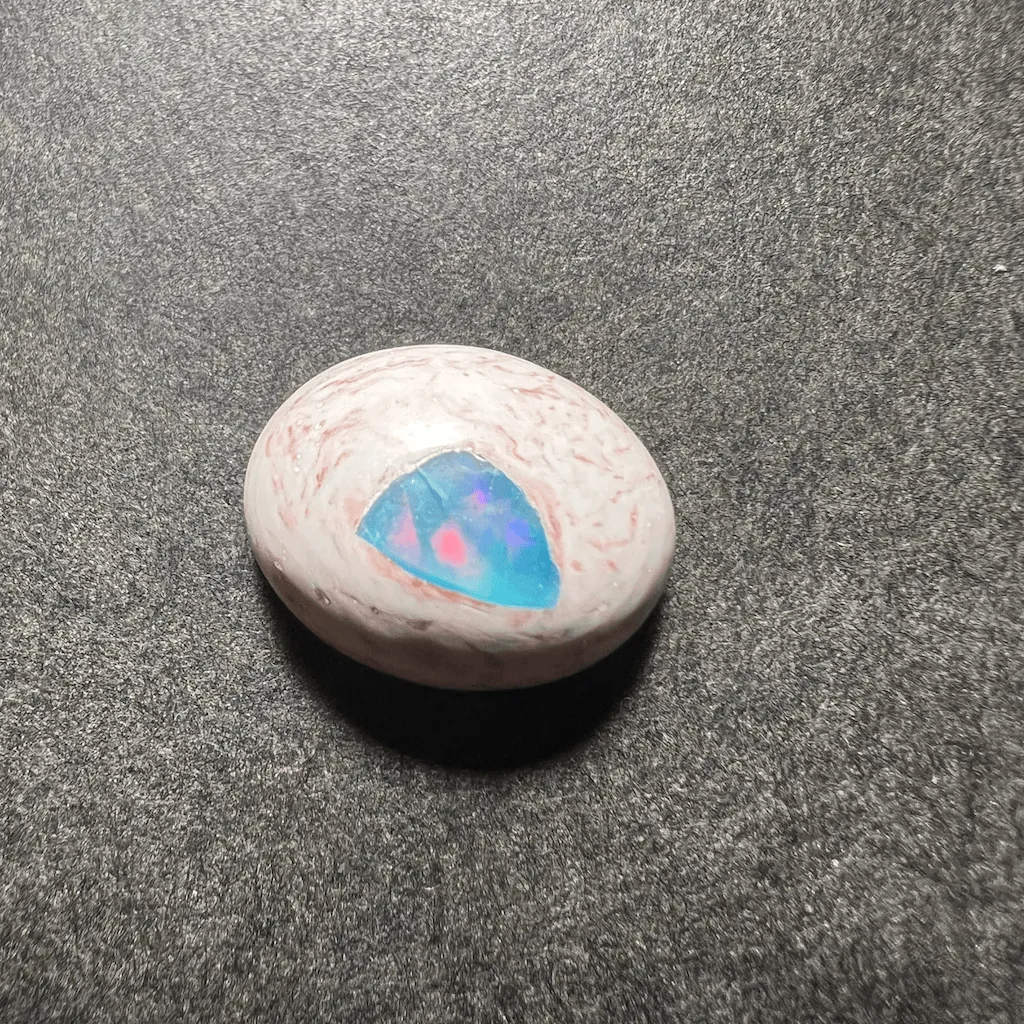 Très beau contraste entre le jeu de couleur de l’opale précieuse au centre de la gemme, et l’opacité beige-rose de la matrice autour. L’opale est naturelle. Mais attention la matière autour est un support fabriqué en résine et poudre de pierre. C’est solide et durable, faut juste éviter les chocs et les produits chimiques trop agressifs.