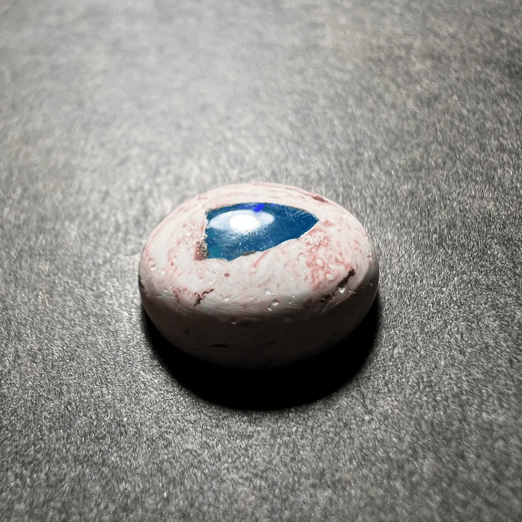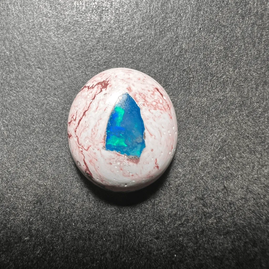 Très beau contraste entre le jeu de couleur de l’opale précieuse au centre de la gemme, et l’opacité beige-rose de la matrice autour. L’opale est naturelle. Mais attention la matière autour est un support fabriqué en résine et poudre de pierre. C’est solide et durable, faut juste éviter les chocs et les produits chimiques trop agressifs.