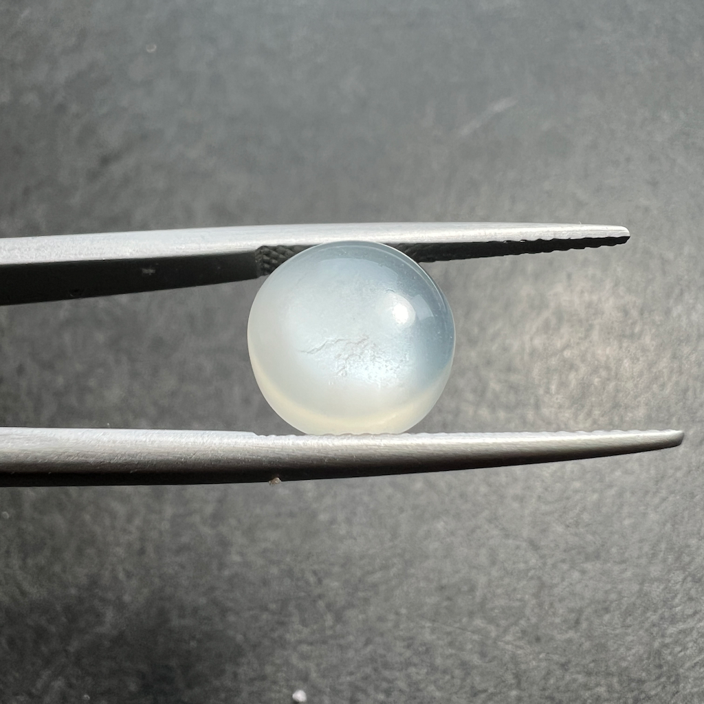 La pierre de lune blanche montre un effet blanchatre semblant flotter à l’intérieur de la pierre. Comme sa cousine la labradorite, la pierre de lune est une variété de feldspaths clivant facilement, donc attention lors du sertissage à bien respecter les précautions d’usage en bijouterie.