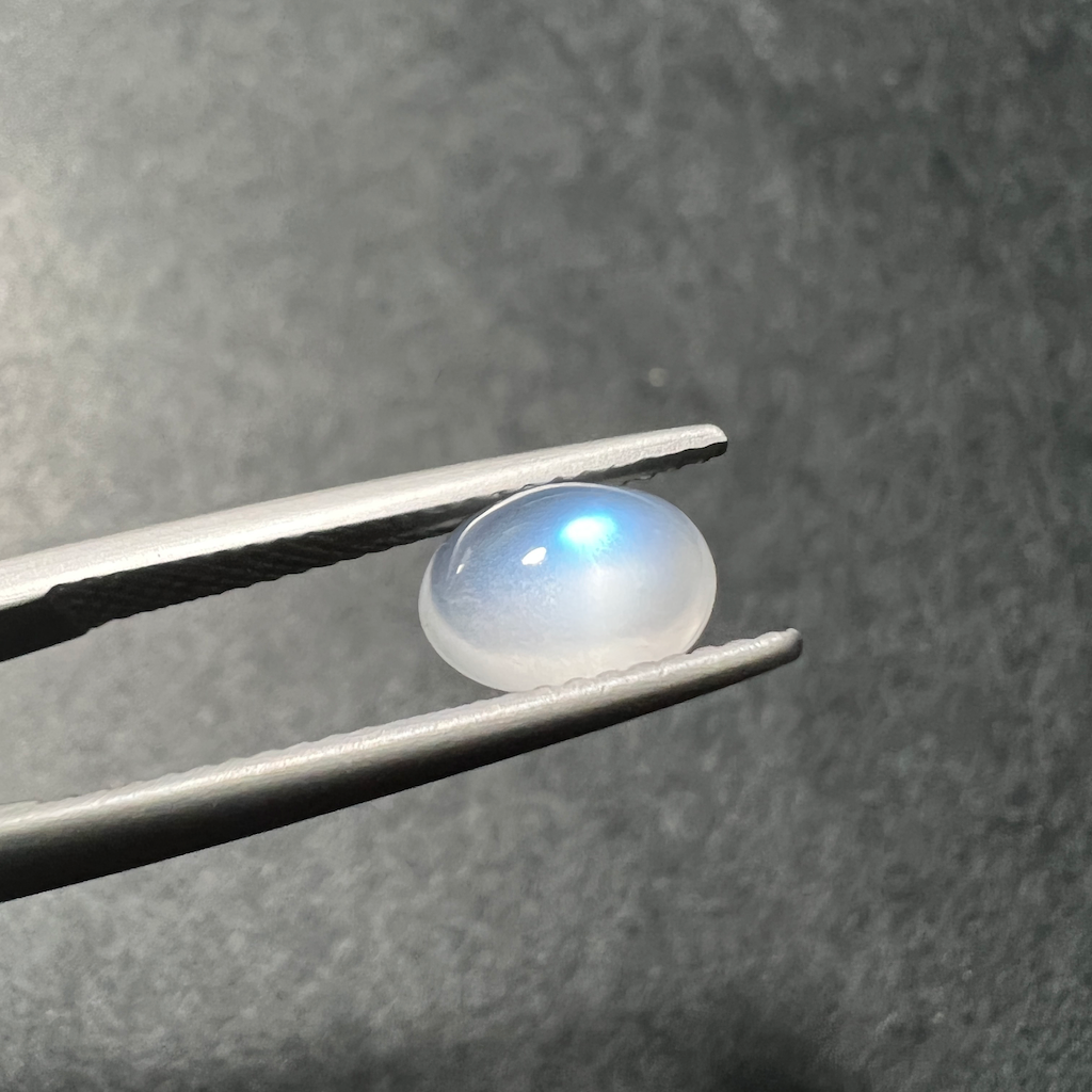 La pierre de lune montre un effet bleuté semblant flotter à l’intérieur de la pierre. La variété présentée ici est laiteuse, d’un plus bel effet tout en douceur.