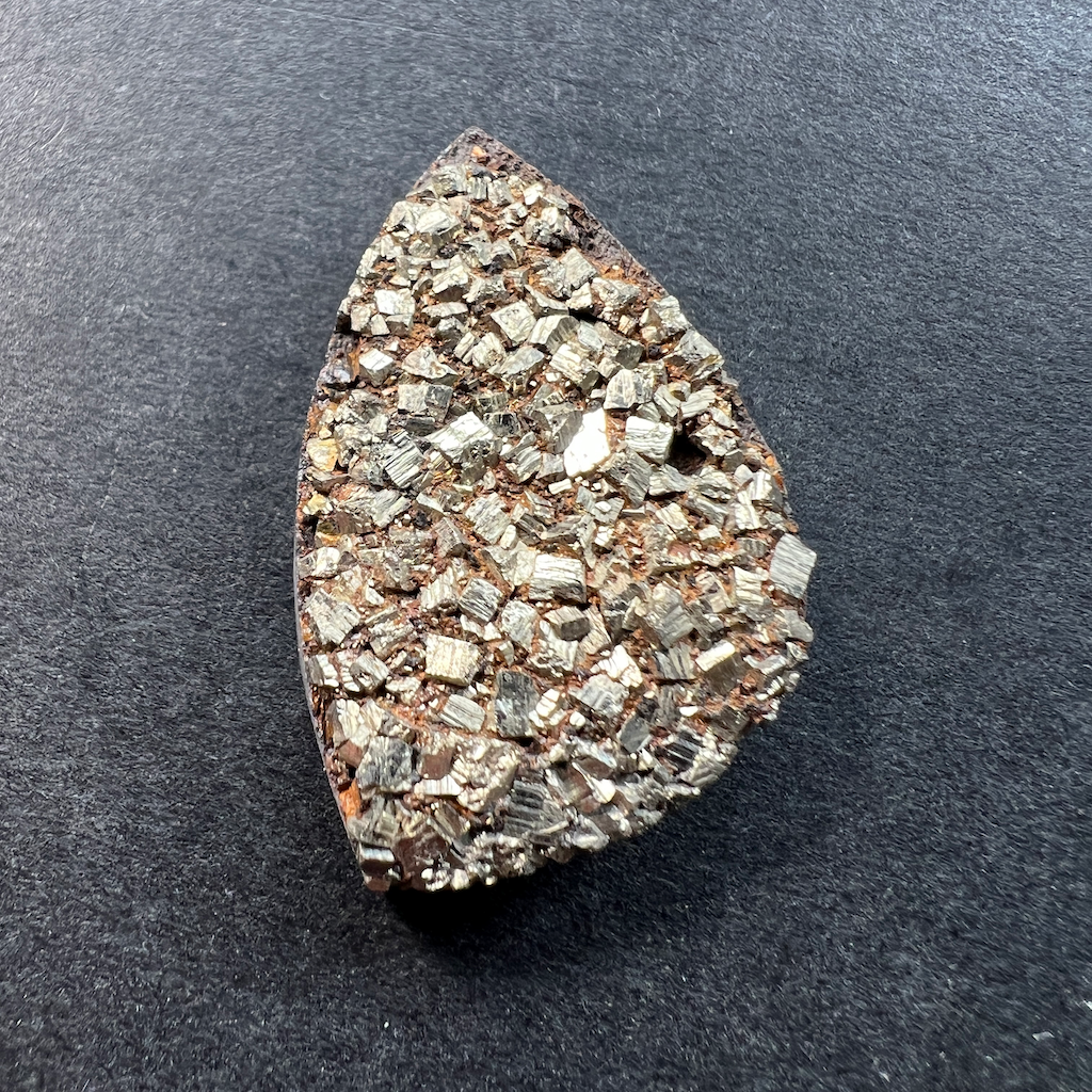 Superbe druse de pyrite sur basalte, les cristaux de pyrite restent bruts et conserver leurs reflets brillants d’un plus bel effet.