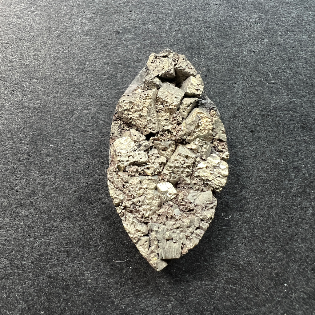 Superbe druse de pyrite sur basalte, les cristaux de pyrite restent bruts et conserver leurs reflets brillants d’un plus bel effet.