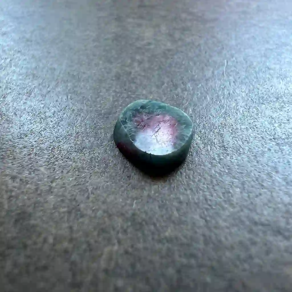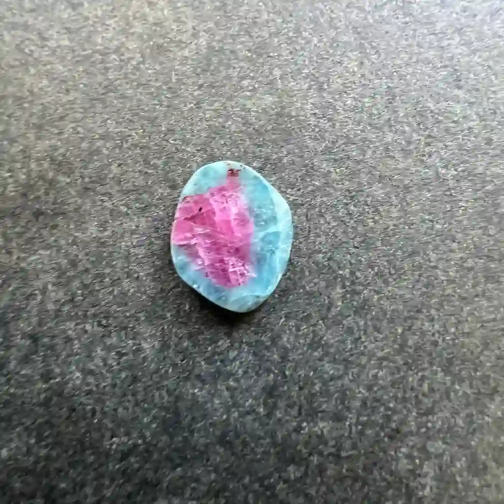 Tranche fine de rubis sur matrice de cyanite. Offrant un beau contraste entre le rouge du rubis et le bleu de la cyanite. Attention tranche très fine, regardez l’épaisseur et les photos.