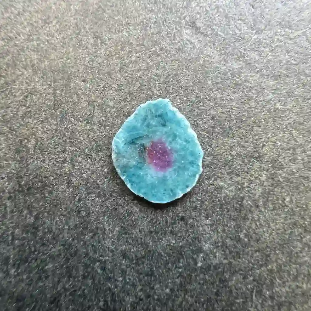Tranche fine de rubis sur matrice de cyanite. Offrant un beau contraste entre le rouge du rubis et le bleu de la cyanite. Attention tranche très fine, regardez l’épaisseur et les photos.