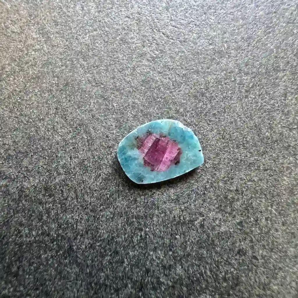 Tranche fine de rubis sur matrice de cyanite. Offrant un beau contraste entre le rouge du rubis et le bleu de la cyanite. Attention tranche très fine, regardez l’épaisseur et les photos.