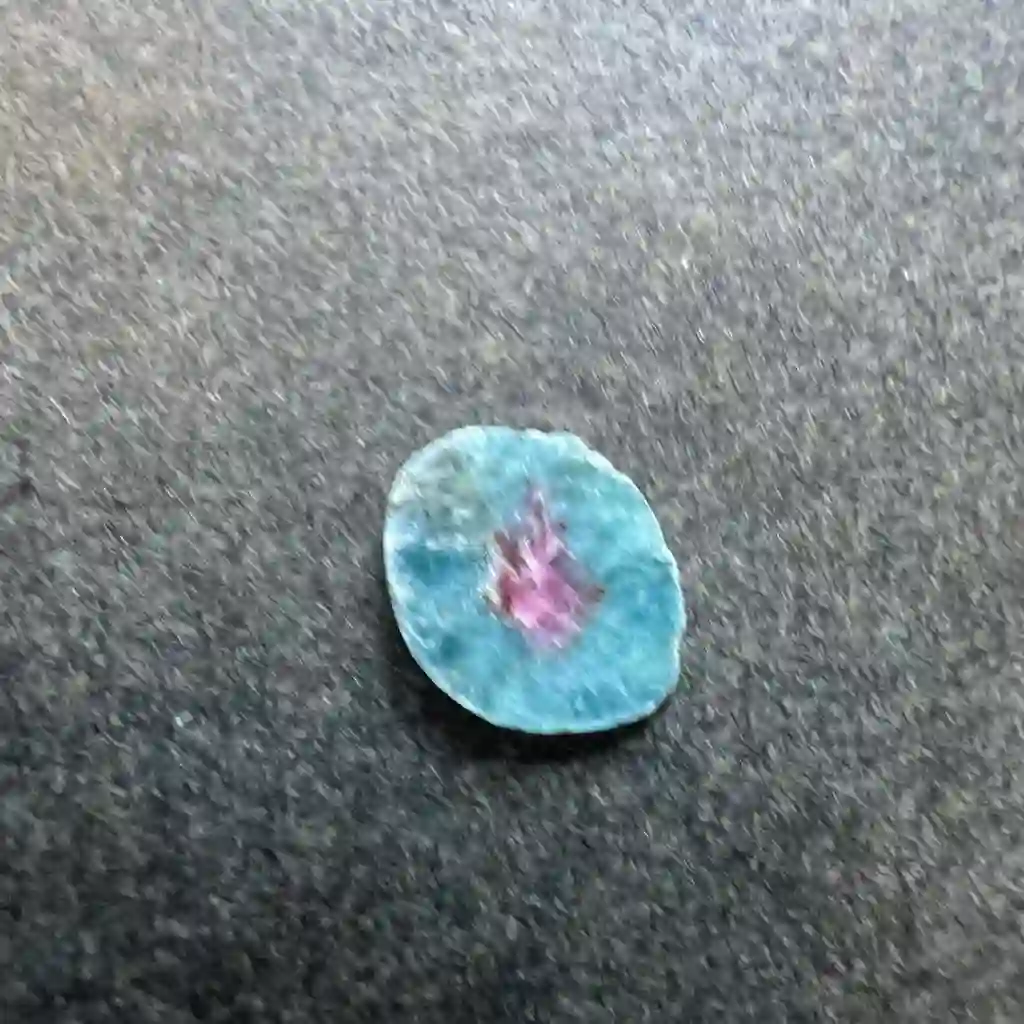 Tranche fine de rubis sur matrice de cyanite. Offrant un beau contraste entre le rouge du rubis et le bleu de la cyanite. Attention tranche très fine, regardez l’épaisseur et les photos.