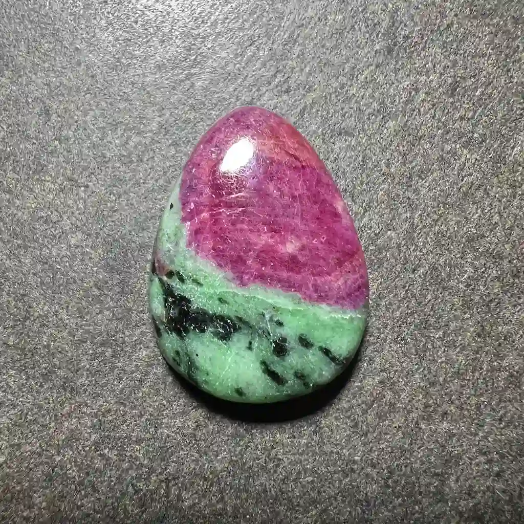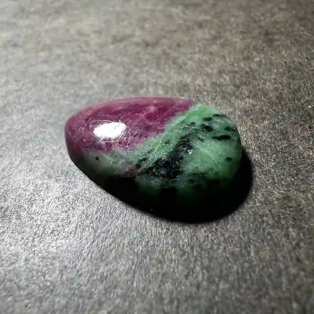 Roche dans laquelle le rouge du rubis ressort superbement sur le fond vert de la zoïsite. Sélectionnée dans sa plus belle qualité. Appellation commerciale : anyolite.