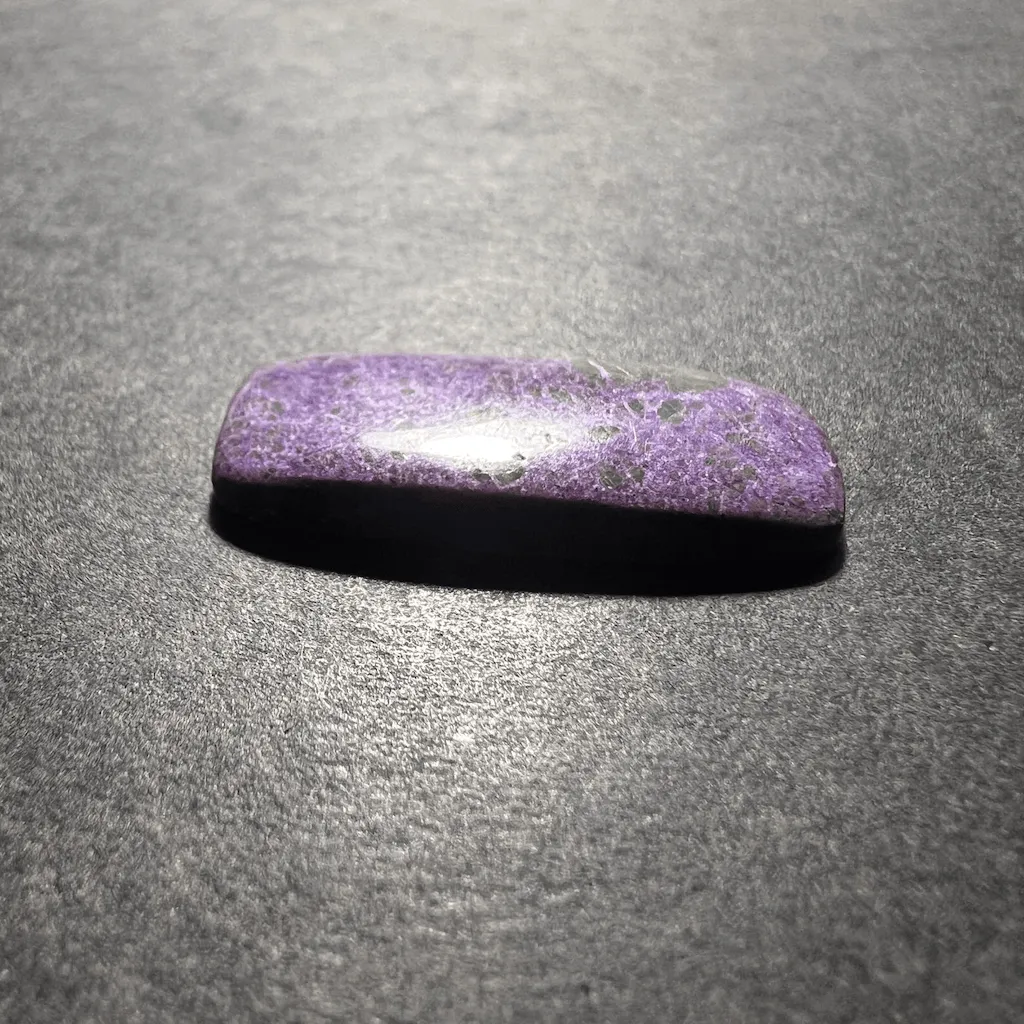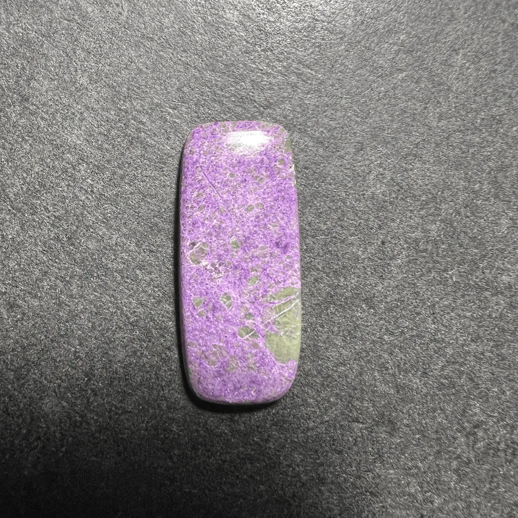 La stichtite est rarement proposée. Ici, les pierres ont été sélectionnées pour l’intensité de leur couleur violette, entremêlée de fines touches de vert-jaune de la serpentine.